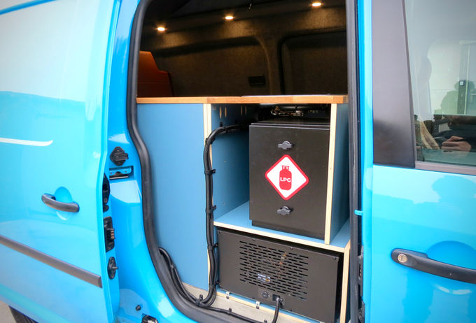 This 4 berth Caddy boasts a comfy and spacious Vulcan-M rock’n’roll bed with tan coloured eco-leather matching the front Adapt seats that carry a tasteful piping centre. Surrounding the bed is a lovely blue laminated ply and oak topped interior that was designed by Adapt to ensure the compact van feels flowing and open, yet still providing plenty of storage and useful amenities. This space is drastically increased by opening the pop top roof, allowing stand up height, adding daylight and ventilation. The kitchen area hosts a 20L drawer compressor fridge and double gas dometic hob, with a fold away oak table that allows additional worktop space.